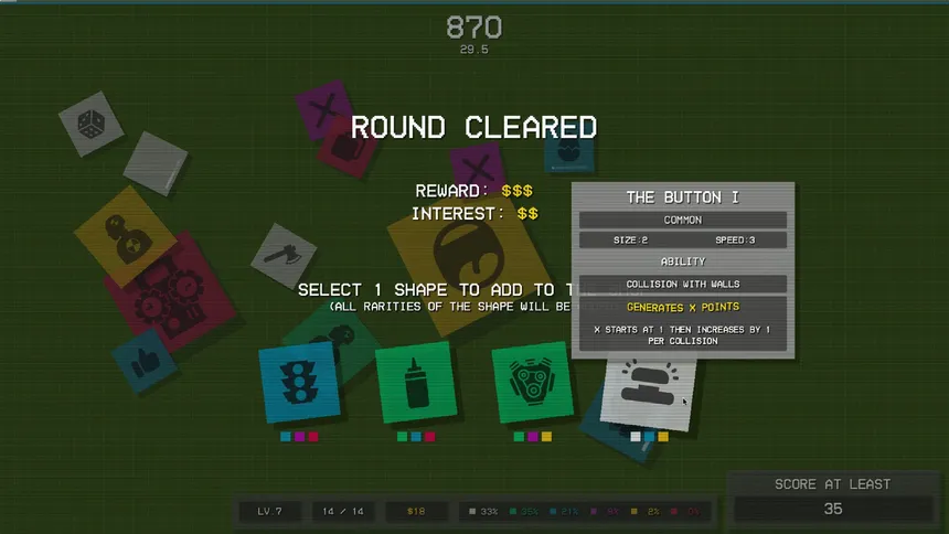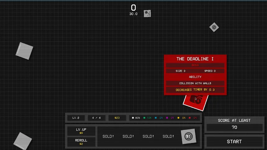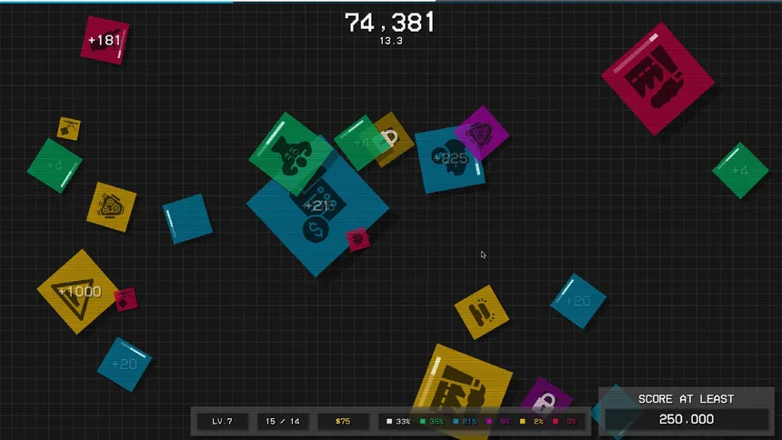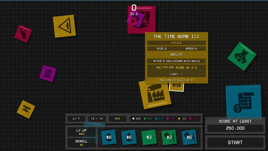 Buy various squares from the shop, discover new synergies, and watch them bounce around the screen while they generate points. You only have 30 seconds per round. How far can you go?