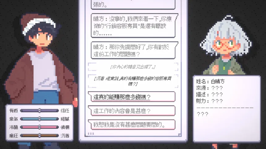 Now Hiring is a top-down narrative adventure where you play a job seeker trapped in a scam syndicate. Across 21 days, your choices in dialogue battles and moral dilemmas will shape your fate, reveal human struggles, and lead to multiple endings.