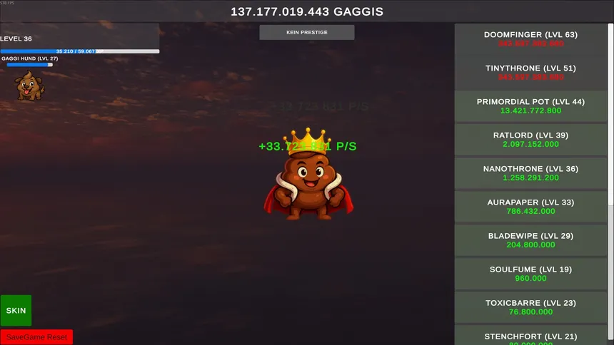 Click, collect, upgrade! In Gaggi Clicker, you gather endless Gaggis, boost your production with upgrades, auto-clickers and prestige – and with future updates, even more features are waiting for you!