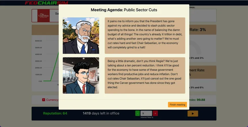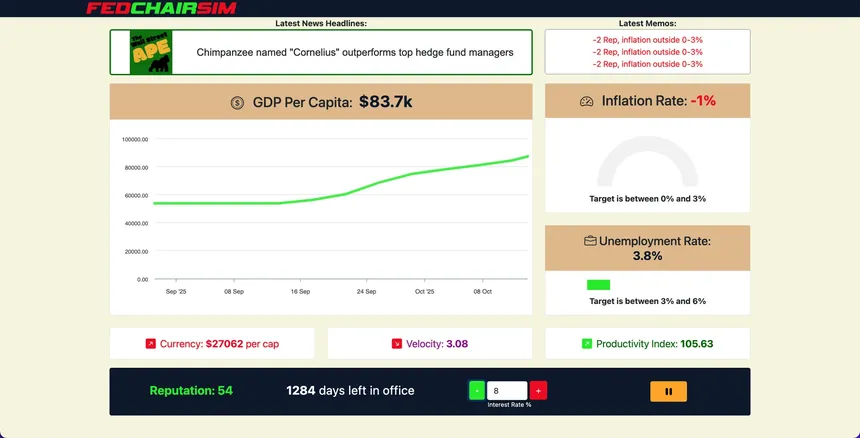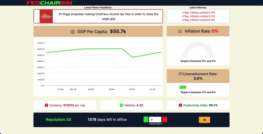 FedChairSim – это не просто экономический симулятор. Это уникальное сочетание серьезной макроэкономики и социального и политического театра современности. Меняйте целевой уровень инфляции, "подкручивайте" показатели CPI и безработицы – и следите за реакцией СМИ на ваши действия!