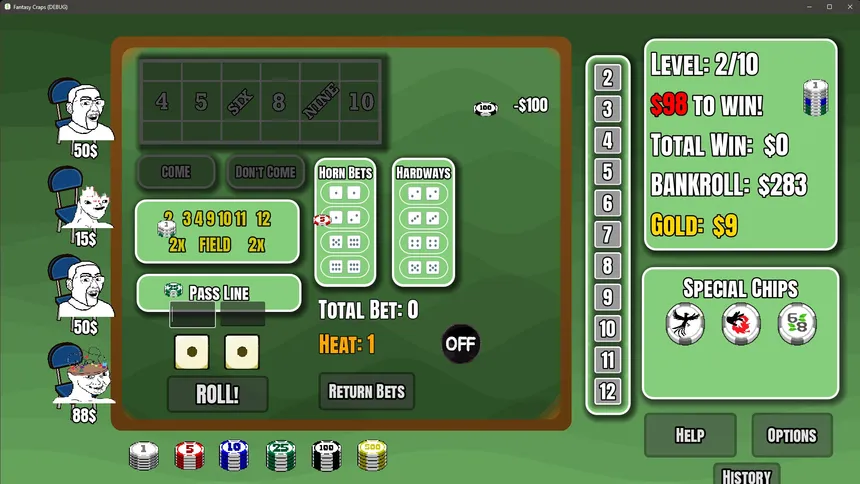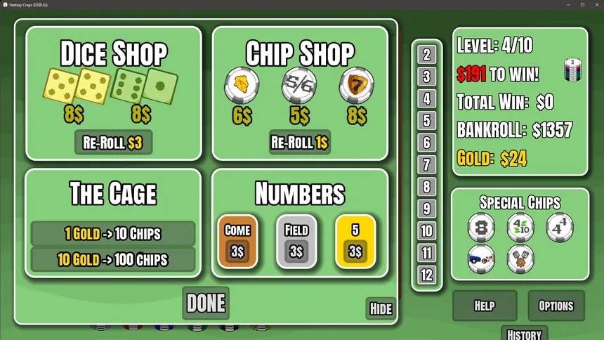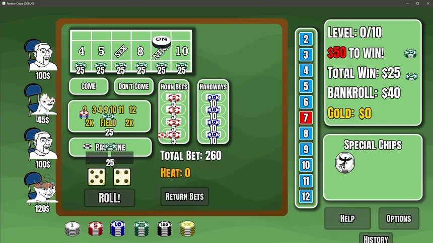 6 ways to 7 is a high-stakes roguelike twist on the classic dice game Craps! It combines the hard choices of a roguelike, with the push your luck gameplay of craps!