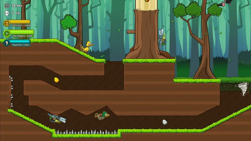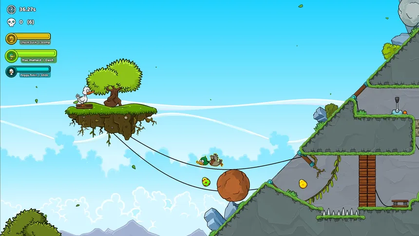 A puzzle-platformer where three ducks (Chuck, Mac, and Peggy) combine their unique abilities to recover eggs, cleanse poisoned ponds and outsmart traps across handcrafted levels.