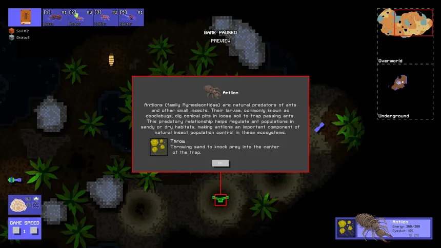 Real-time ant colony simulation inspired by the fascinating living strategies of ants. Cultivate symbiotic fungus, manage worker castes, explore tunnels and surface, and defend your nest as day and night shape a living world above and below ground.
