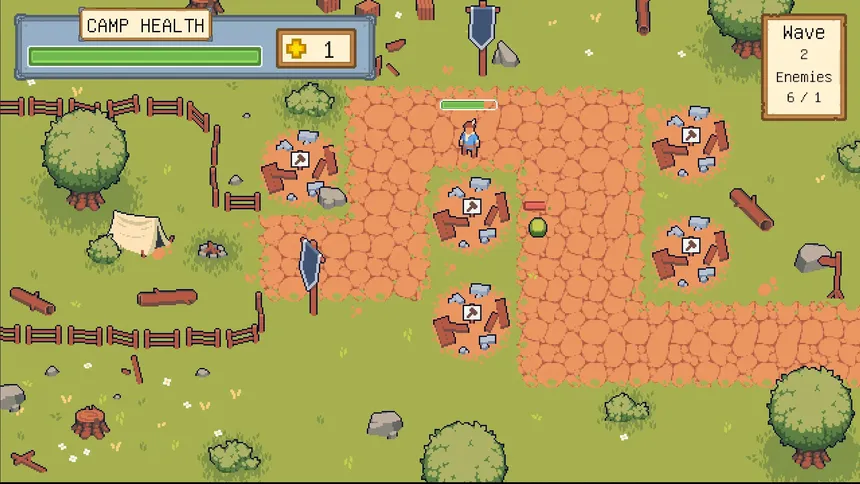 You are responsible for guarding a wilderness camp. For some reason, slimes from the grassland are swarming toward you. You need to build defensive towers, provide positions for archers, and survive the ever-increasing number of slimes. If too many slimes enter your tent, the mission fails.