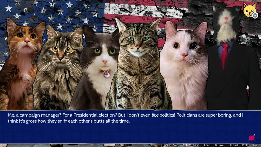 Cat President: 3rd-Rate Candidate — игра от компании Oh, a Rock! Studios, разработанная для платформы PC. Проект совмещает в себе такие жанры и элементы, как визуальная новелла. Дополнительно игроки выделяют такие особенности игры, как котики, визуальная новелла, симулятор свиданий и политический симулятор. Игра рассчитана на одиночное прохождение, многопользовательские режимы не предусмотрены.