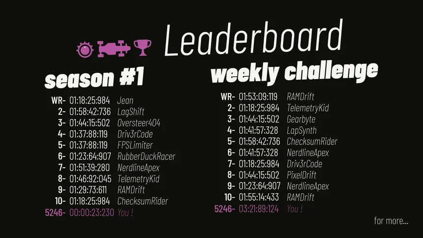Восемь регулируемых параметров, одна трасса, но бесконечные возможности для настройки и улучшения. Динамичная система обратной связи мягко подталкивает вас к совершенству, а сезонные обновления трасс не дадут вам заскучать. Минималистичная графика в черно-белых тонах подчеркивает концентрацию на игровом процессе и физике вождения.