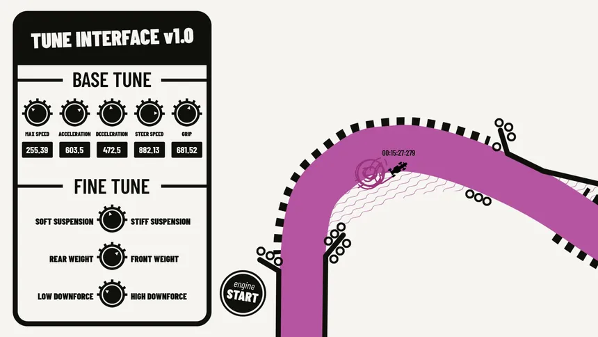В этой минималистичной racing-игре от Bloodyhands, разработанной для PC, каждый ваш проход – это шанс побить собственный рекорд. Настраивайте параметры автомобиля, выезжайте на трассу и почувствуйте, как даже незначительные изменения влияют на скорость, сцепление и управляемость. Поиск идеального баланса – вот что делает Tune to Win по-настоящему захватывающим.