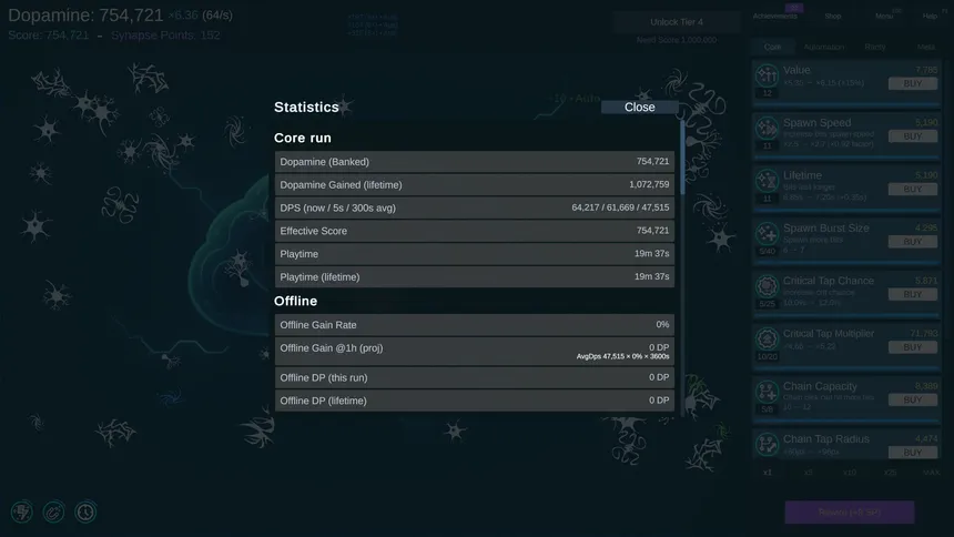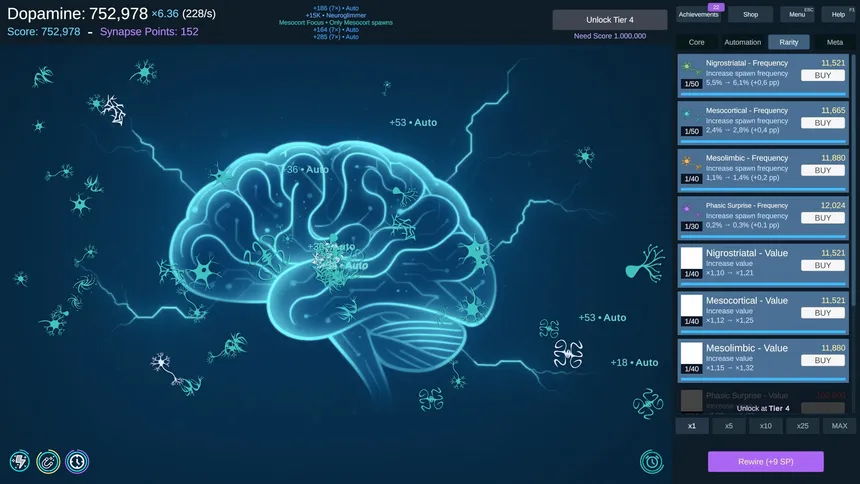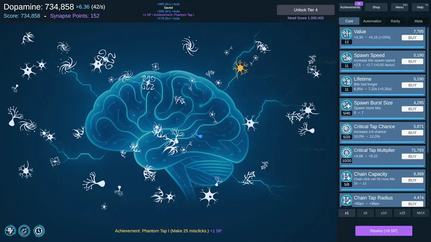 Механика игры предельно проста: кликайте по появляющимся "битам дофамина", зарабатывайте DP (очки дофамина), инвестируйте их в апгрейды и автоматизируйте процесс. Система Rewire позволяет с каждым новым прохождением увеличивать эффективность и открывать новые горизонты прогресса. Повышайте свой Effective Score, чтобы получить доступ к более мощным улучшениям и уникальным функциям.