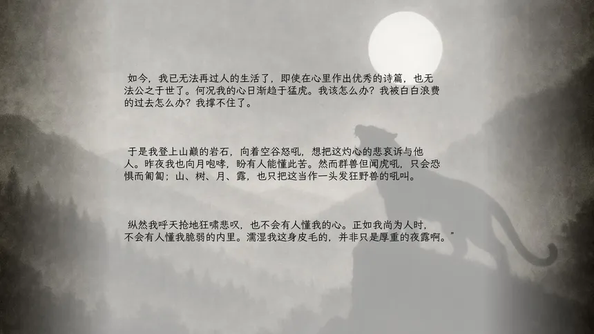 山月记-人虎传 – это визуальная новелла от компании 山月, погружающая в трагичный мир переосмысления классической японской истории “Тигр-поэт” Ацуси Накадзимы. Игра переносит вас в эпоху династии Тан, где вам предстоит прожить историю Ли Чжэна, ученого, раздираемого внутренними конфликтами и отчаянием, которые приводят к его превращению в тигра.