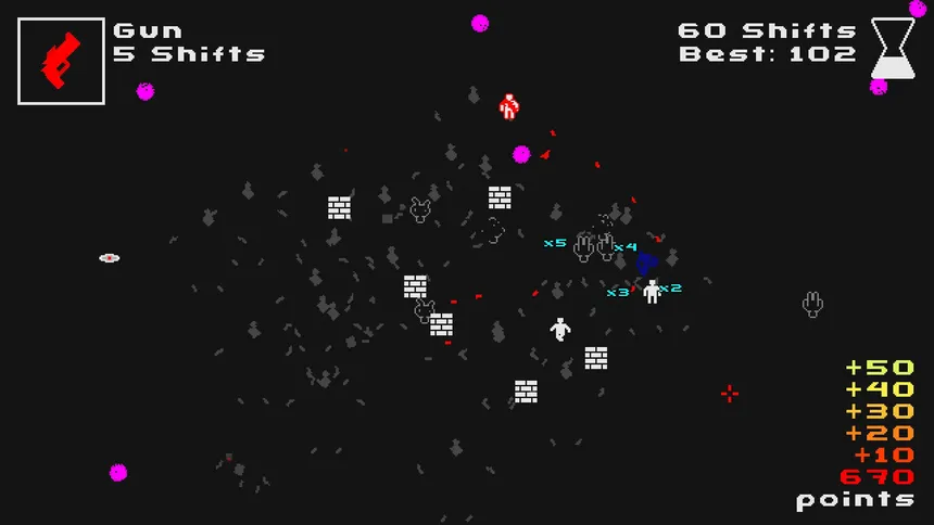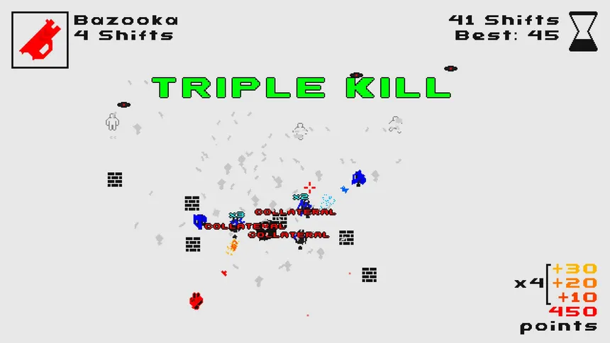 Salt VS Pepper is a twin-stick shooter where you switch between black and white every 3 seconds, leaving behind an evil clone every time you switch! Use guns, walls, bowling balls, and anything in between as a weapon!