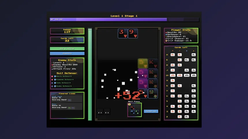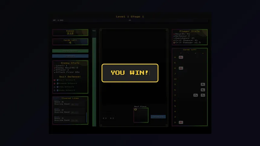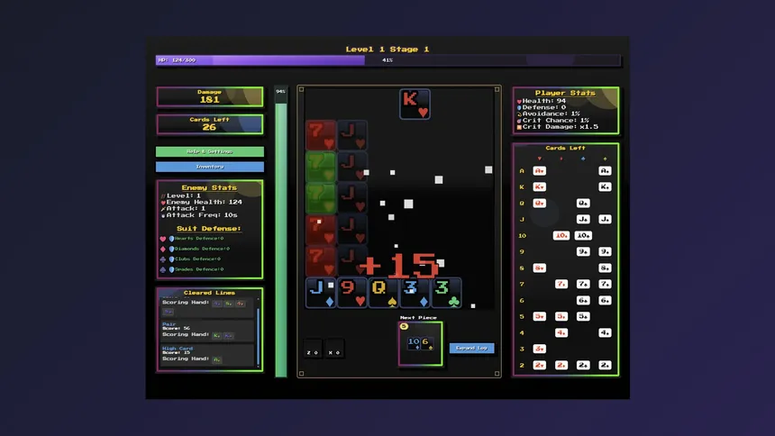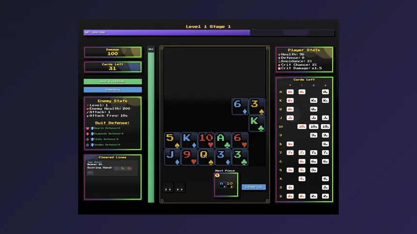 A fast retro puzzle poker casual game. Move card pieces around and build up powerful combos to deal damage! Balance between risks and rewards. Plan your board, use consumables, upgrade to get new cards new passives each stage to help you win! Try out new builds and see how far you can go!