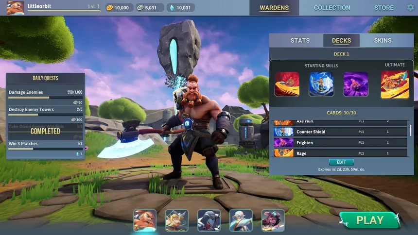 StoneHold is a free-to-play 5v5 action MOBA where collectible card strategy meets intense third-person combat. Pick a Warden, build a deck, draw by crushing turrets and defeating enemies, then swap cards and skills at base for constant counterplay. UE5 visuals and a world of chiseled stone magic.