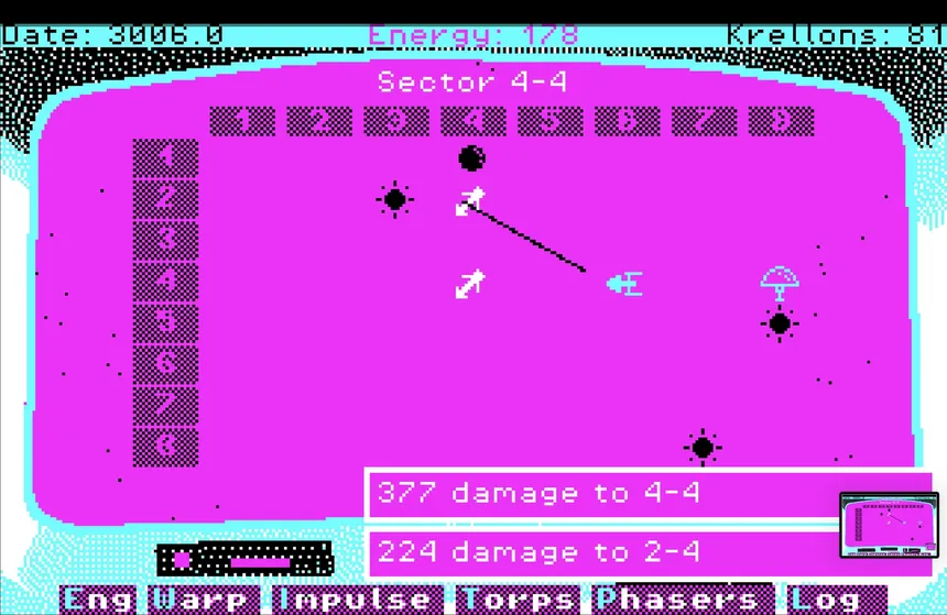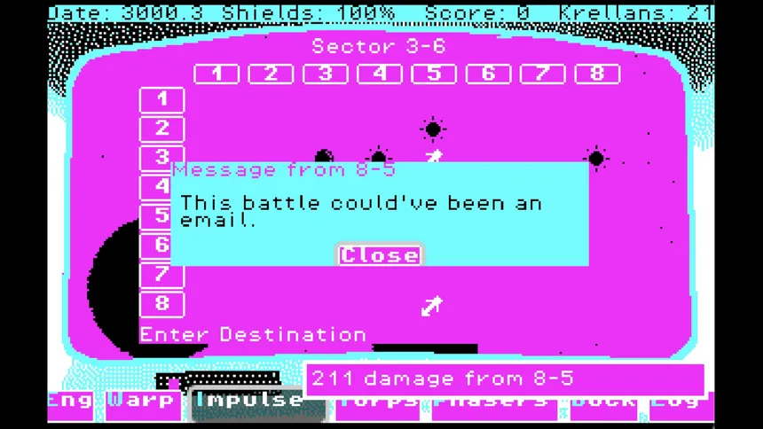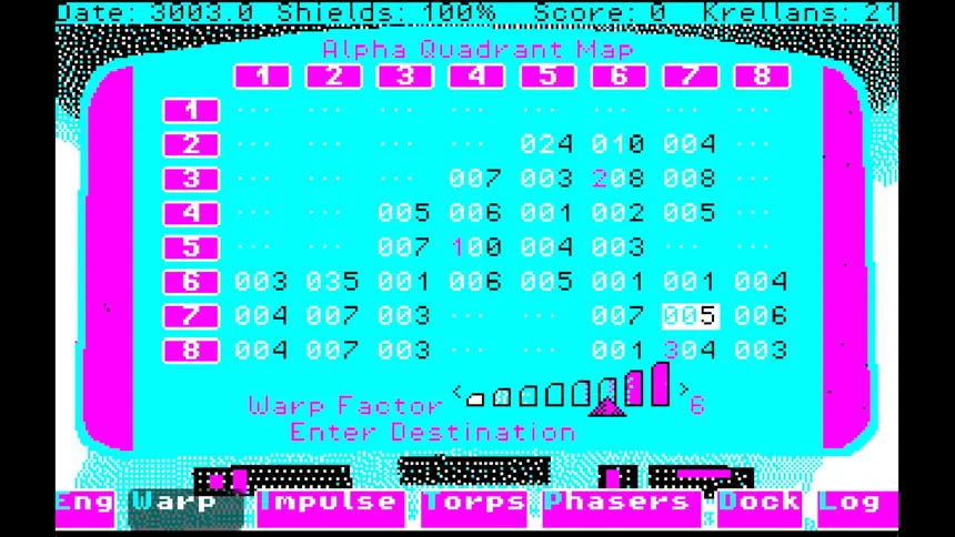 Cyan Alert! Set your eyeballs on stunned because it's time for CGA Trek! Your continuing mission is to seek out and destroy an invading fleet of warships in this modern homage to the classic turn-based strategy "Trek" game that originated on mainframe computers in the 1970s.