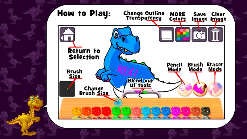 Animal Coloring Books for Kids & Toddlers - Dinosaurs – это не только развлечение, но и образовательный инструмент. Игра помогает развивать координацию движений, концентрацию внимания и чувство прекрасного. А возможность делиться своими работами с друзьями через компьютер добавит азарта и мотивации.