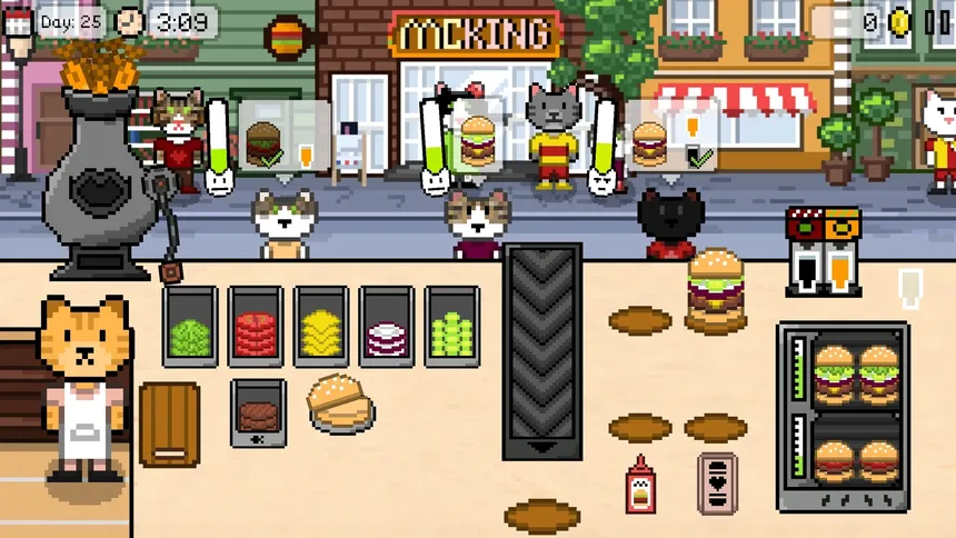 Добро пожаловать в Kitty Burger – уютный симулятор управления временем, где вы становитесь владельцем маленькой бургерной, а ваш верный помощник – очаровательный котик! Готовьте вкуснейшие бургеры, оперативно обслуживайте посетителей и поддерживайте порядок в своем заведении.