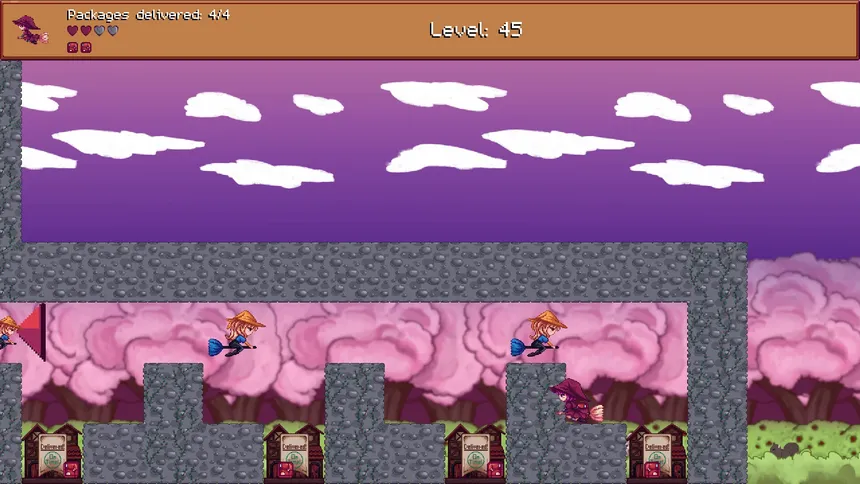 A fast paced auto-scroller where you deliver potions to customers while avoiding the attempts of a big witch company to thwart you. Navigate tight spaces while avoiding porch pirates and witches with malicious intent.