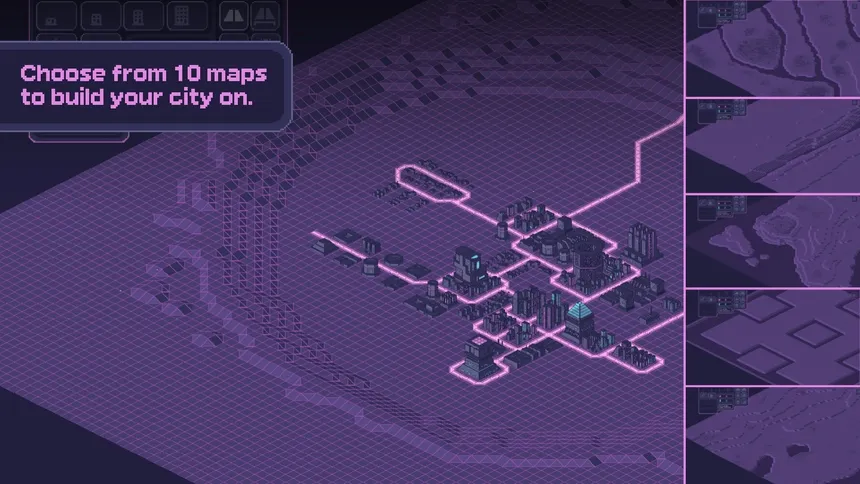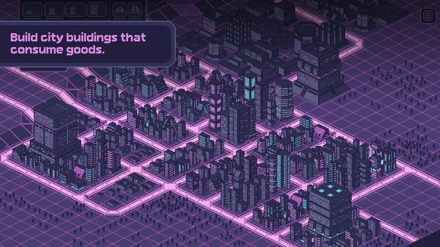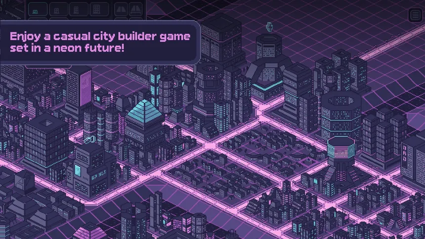 Pixelpolis Neon is a retro-isometric city builder set in a vibrant cyberpunk future. Place over 400 hand-drawn pixel art buildings, balance population and available goods, and craft your own neon-lit dream city to the sound of pulsating synthwave.