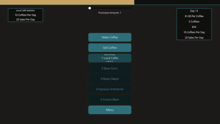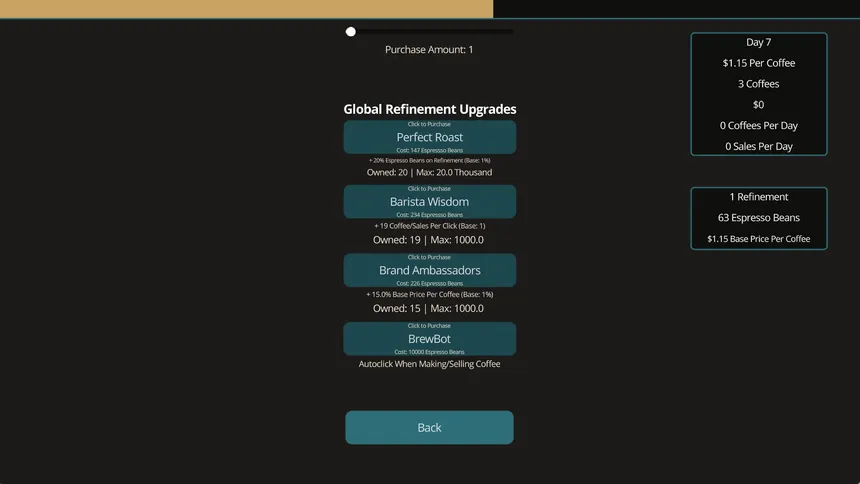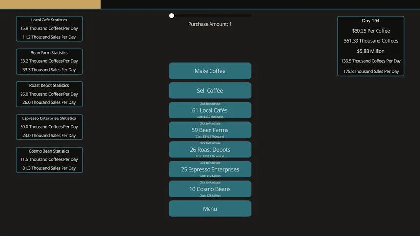 CaffiNation is a Free To Play Idle game about selling Coffee and making Money! Try and balance out your production and sales to refine your business and upgrade your new empires with Espresso Beans!