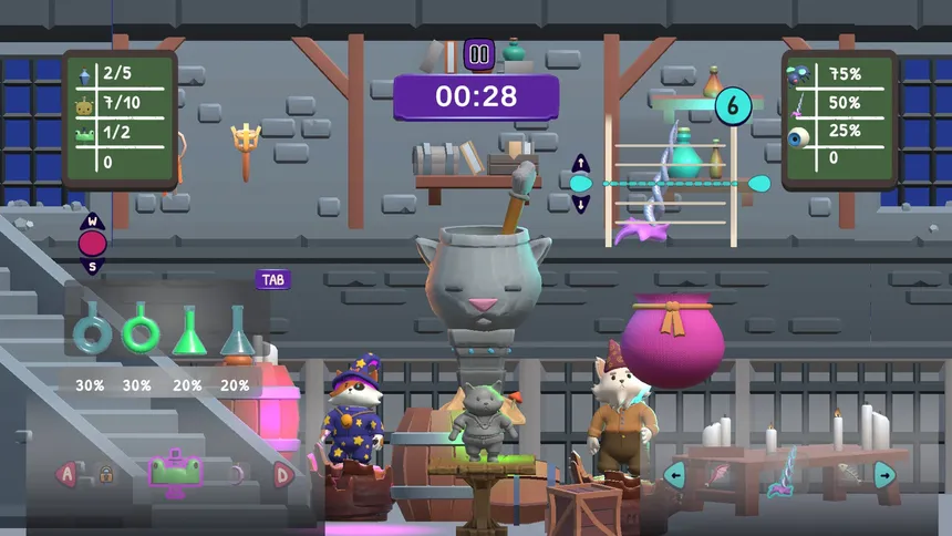 Miautemágica – это обучающая 3D-игра для локального кооператива. Два котенка-алхимика вместе создают зелья, чтобы спасти Королевство Усов от ужасной Мяудузы. Каждое зелье развивает логику, смешивая дроби и проценты. Сотрудничайте и учитесь!