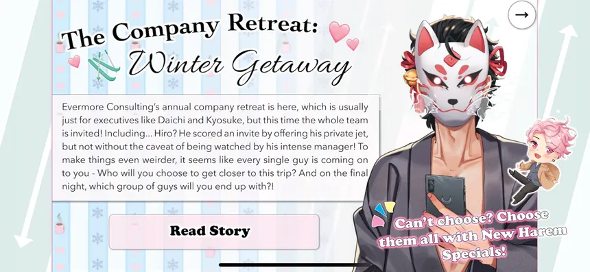 My Love for You is Evermore is an interactive office-romance visual novel. Customize your character, explore branching dialogue choices, and experience voice calls from your suitors as you pursue multiple endings in a star-studded love story.