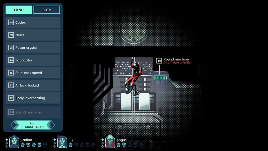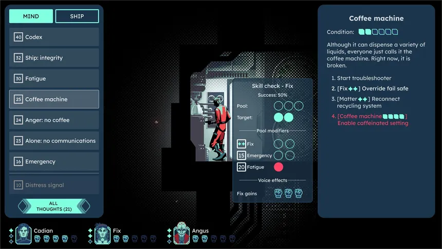 A narrative sci-fi RPG where you can only interact with the seven thoughts currently on your mind. Research and repair a mysterious battleship. Manage your headspace and survive the quarreling voices living inside it or thrive in the madness.