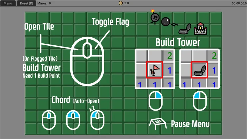 Основная цель – открывать безопасные клетки, чтобы собирать информацию о расположении мин, вовремя отмечать опасные зоны флагами и, самое главное, вовремя возводить защитные башни. Каждый ход имеет значение, а грамотное использование всего лишь одной точки строительства может стать решающим фактором.