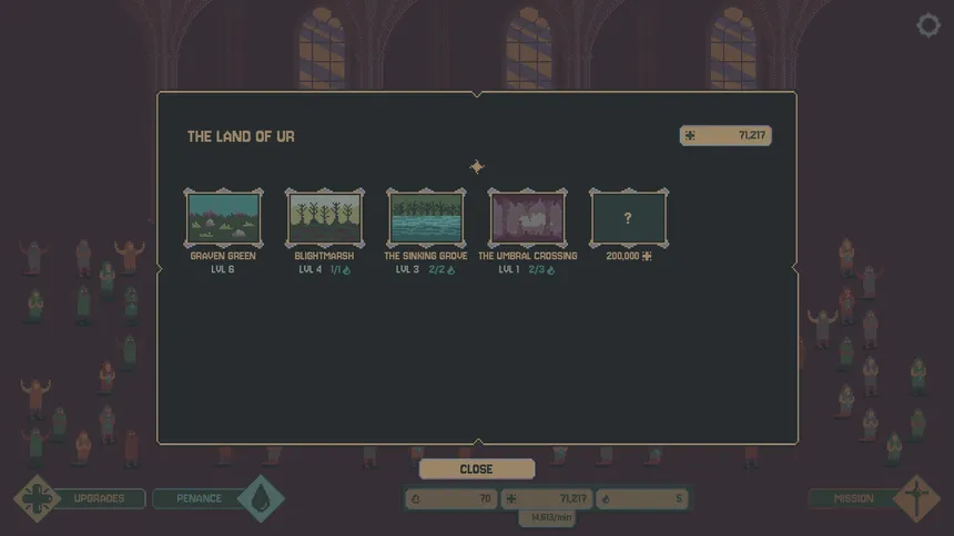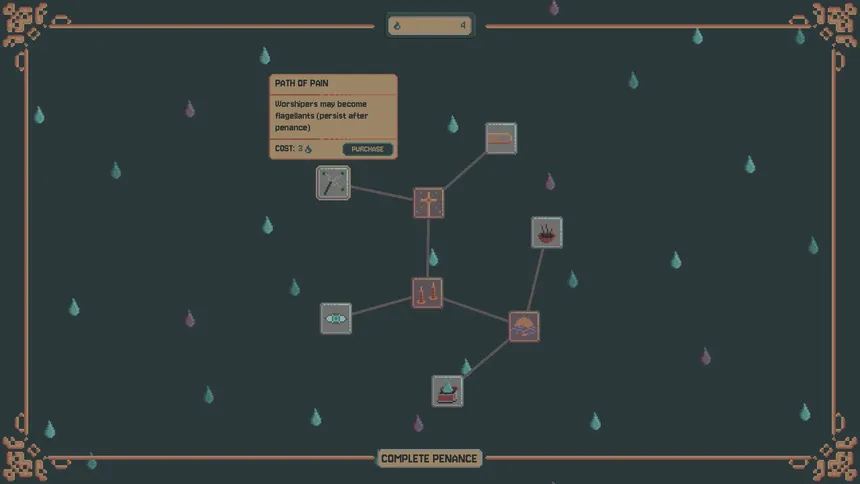 Вам предстоит искать отступников и возвращать их к вере, используя крест как символ очищения. Превращайте культистов в преданных прихожан, чтобы часовня росла и процветала. Прихожане будут молиться, генерируя благочестие, которое станет вашей валютой для улучшений и открытия новых областей.
