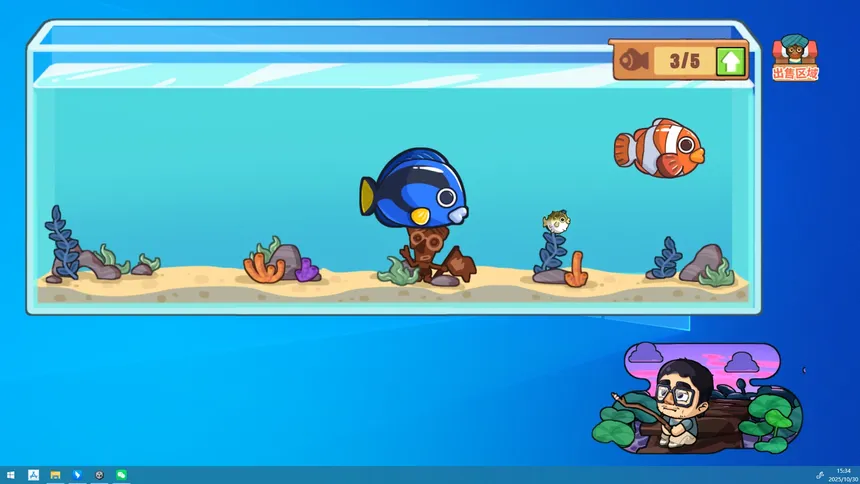 This is a desktop mini-game. Tim will be your desktop pet, fishing non-stop until he catches a palm-sized fish.You can put the caught items into the fish tank or sell them to exchange for costume items.