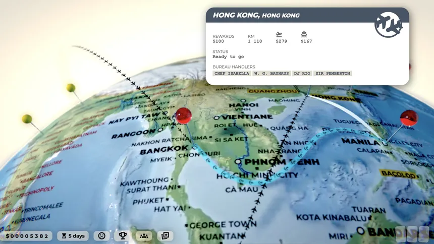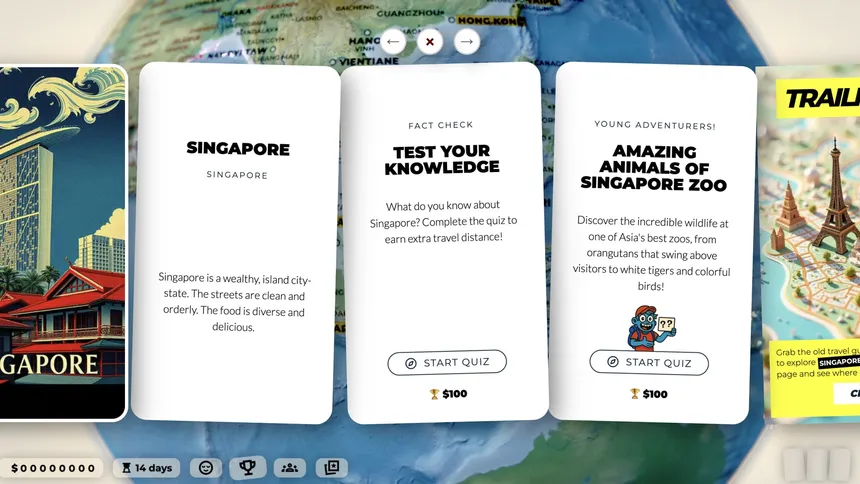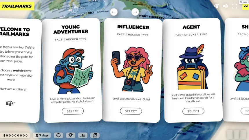 A web-based geography adventure where you circumnavigate the globe as a fact-checker for Trailmarks Travel Guide. Choose your traveller type and home city, navigate by air, boat, bus, or train across an interactive 3D globe, answer trivia, trade goods, and unlock countries with local expertise.