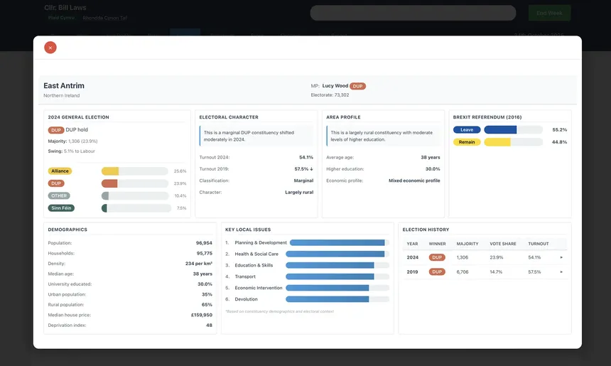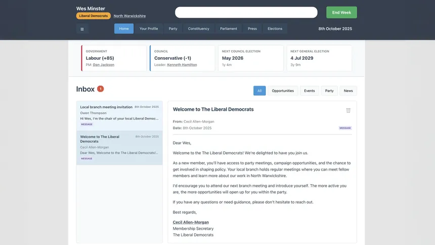 Over 20,000 simulated politicians, journalists and activists. Every one unique. Every one autonomous. Build your career from local councillor to Prime Minister in the most detailed UK political simulation ever created. No scripts. Pure systems-driven gameplay.