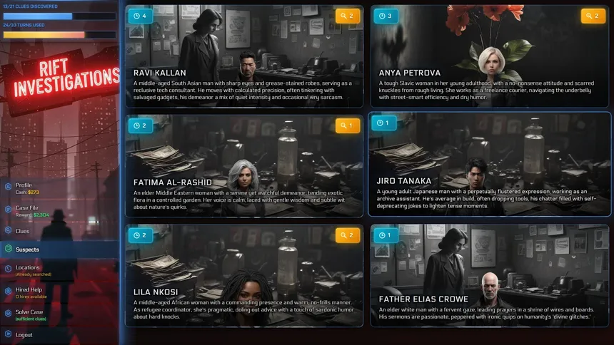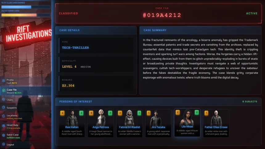 Расследуйте процедурно генерируемые нуарные тайны в постапокалиптическом мире, где реальность раскалывается, а истина субъективна. Допрашивайте подозреваемых, обыскивайте места преступлений и делайте выводы, отделяя правду от лжи, в этой детективной игре на основе ИИ, где каждое дело уникально.