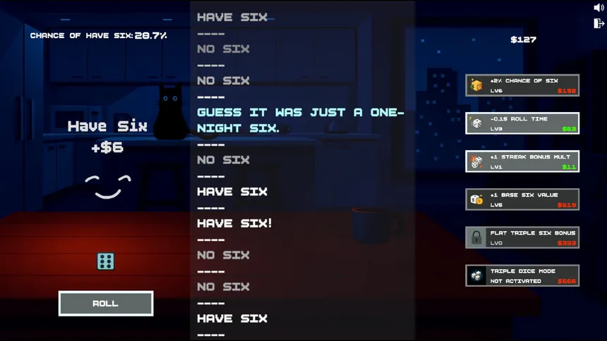 A non-idle clicker game about rolling dice that might not in your favor. Roll dice. Get sixes. Don't break your streak. Starting with barely any luck, can you roll nine sixes in a row?