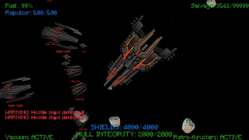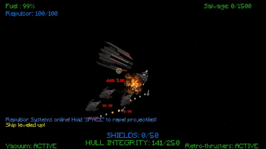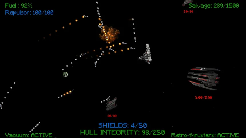 Physics-based arcade, top-down space shooter. Pilot the Salvager, collect salvage to upgrade your ship, balancing an economy by mining asteroids and fending off waves of enemy ships, ultimately growing so large as to destroy planets.