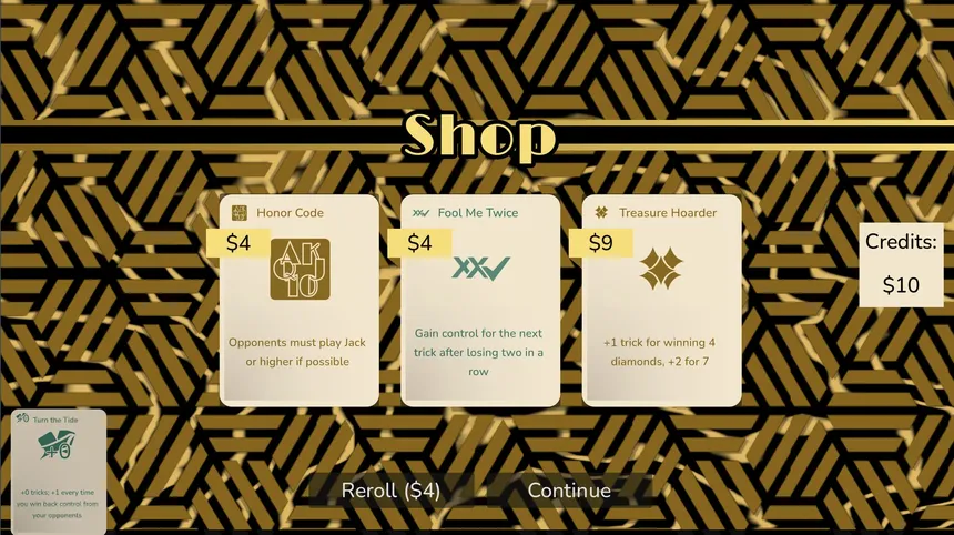 A trick-taking roguelike with style! Outplay your rivals, purchase special abilities, and dazzle 1920s high society with your unstoppable cardplay. Call your contract, follow suit, flush trumps, and claim the hand. This isn't your grandma's bridge club... this is Overtrick!
