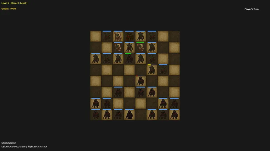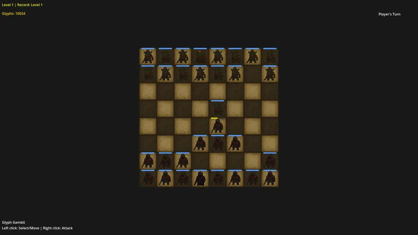 A turn-based tactical roguelite where you battle across grid-based arenas, destroy the enemy King before they destroy yours, and protect your Glyphs—lost if you fall, recoverable only by clearing the level where they dropped.