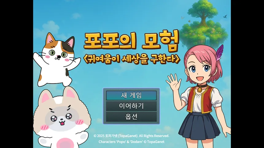 귀여운 포포, 도담, 가넷과 함께 네 개의 탑에서 지도를 모아 부유섬으로 떠나는 동화풍 모험 RPG. 마왕을 무찌르고 요정 여왕을 구해 주세요.