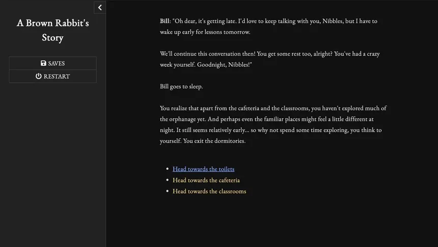 A Brown Rabbit's Story is an interactive storybook, a text-driven adventure where your choices lead to branching paths and multiple endings. In a quiet orphanage, a boy wishes his toy rabbit to life… and together, you must face the world’s cruelties and find hope.