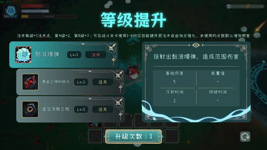 In the game, players will play as a slime and, by defeating swarms of small monsters, continuously upgrade and unlock up to 6 spells and items. By allocating basic attribute points, spell points, they can create their own combat style and eventually defeat the boss and achieve their own legend.
