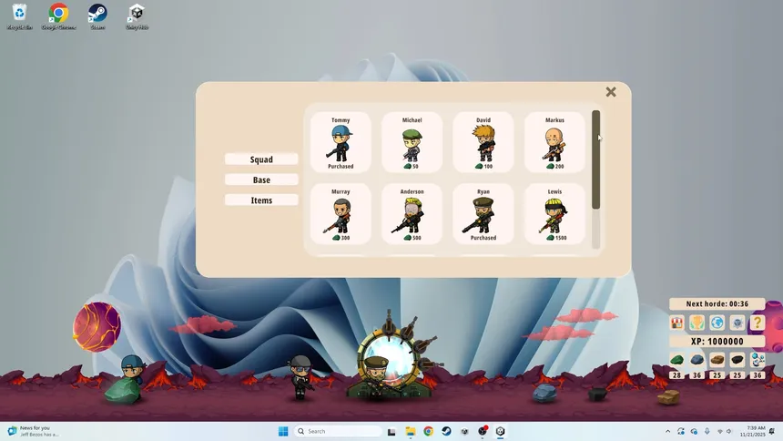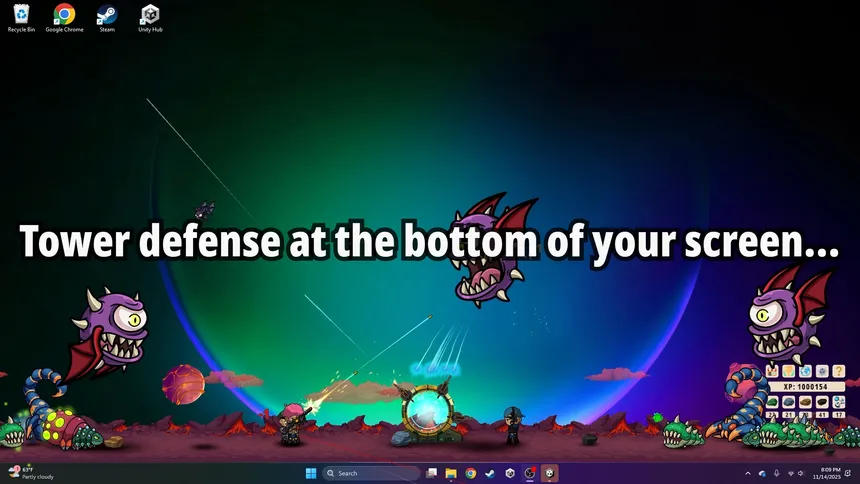 An idle defense game at the bottom of your screen. Build your squad, upgrade your base, and hold the line against relentless alien waves while you work or browse.