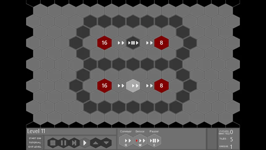 Hex-a-Decimal is an automation puzzle game on a hexagon grid. Set up lines of conveyors, pausers, sensors, and various other components to get signals to where they need to go. It's a challenging game that anyone can pick up, but the question is: how far will YOUR puzzle solving skills take you?