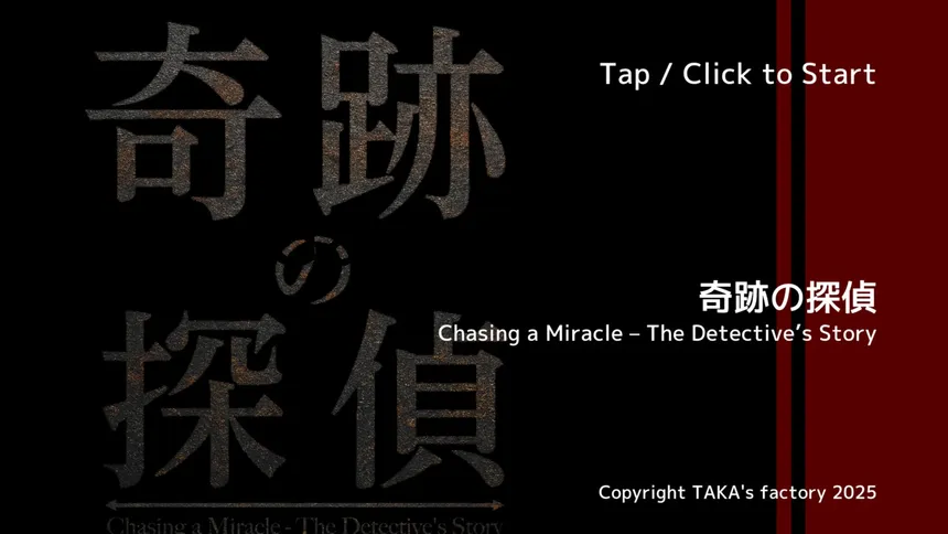 奇跡の探偵 — игра от компании TAKA's factory, разработанная для платформы PC. Проект совмещает в себе такие жанры и элементы, как визуальная новелла. Дополнительно игроки выделяют такие особенности игры, как приключение, визуальная новелла, тайна и юмор. Игра рассчитана на одиночное прохождение, многопользовательские режимы не предусмотрены.