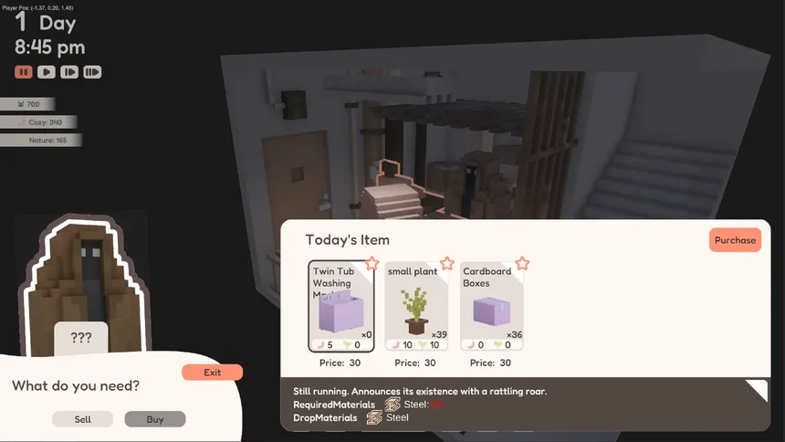 YUME ROOF is a sandbox slow-life game where you customize a voxel-style Japanese rooftop with furniture, colors, crafting, and dress-up. Gather materials, trade items, and improve your Cozy and Nature values to unlock new recipes through the dreams you see at night.