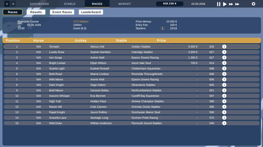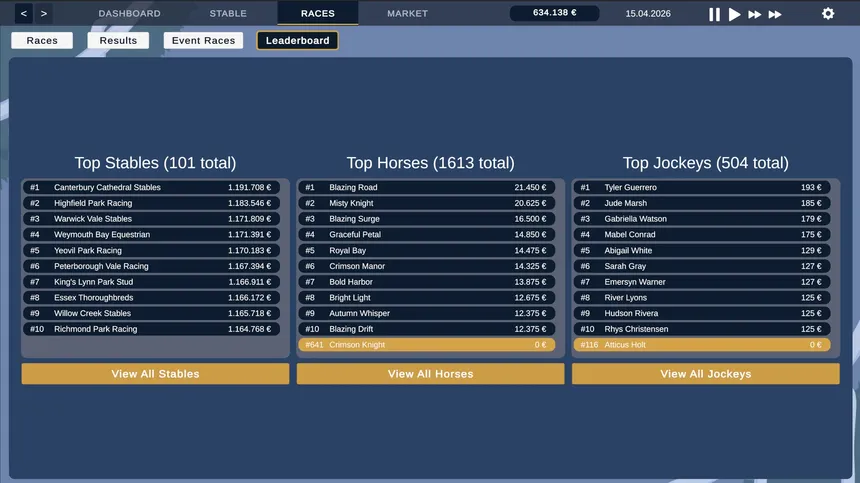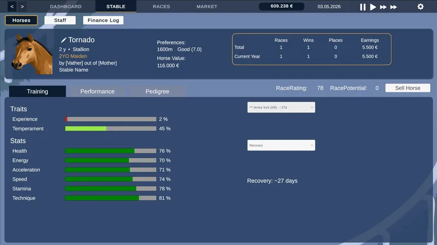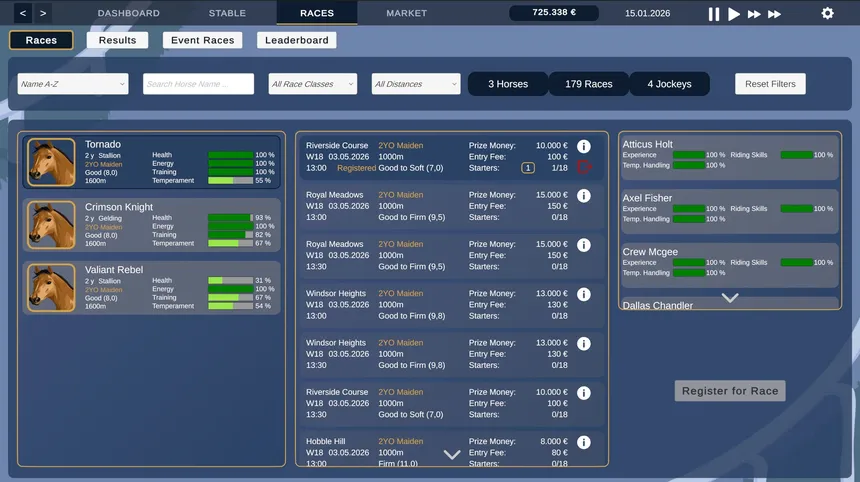 A realistic horse racing management simulation. Buy racehorses, train them, and send them to races with the right jockey. Hire staff, manage finances strategically, and fight your way up through authentic race classes with real distances and times.