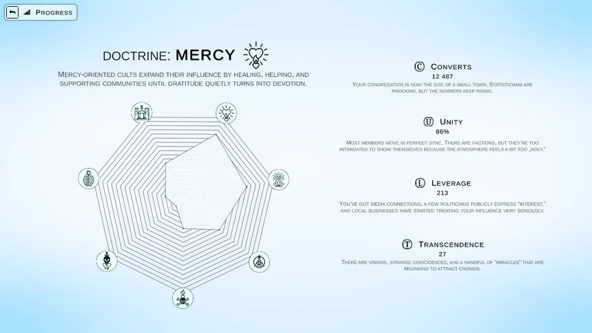 Создай свою религию с нуля. Установи догмы. Вербуй последователей. Расширяй влияние. Каждое решение влияет на твою власть — а любая власть имеет свою цену. Будешь ли ты спасителем или тираном? Мир ждёт твоего хода.