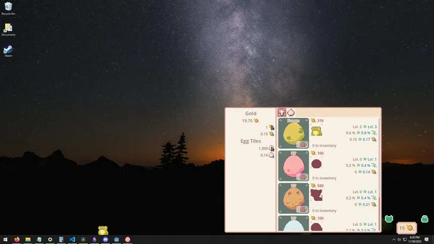 An idle pet-collecting clicker game that keeps you company at the bottom of your screen. Click your egg to help it hatch. Grow your collection of pets to unlock upgrades and rarer eggs. Relax to chill Lofi music while you play at your own pace. Will you hatch the shiny variant of each pet?