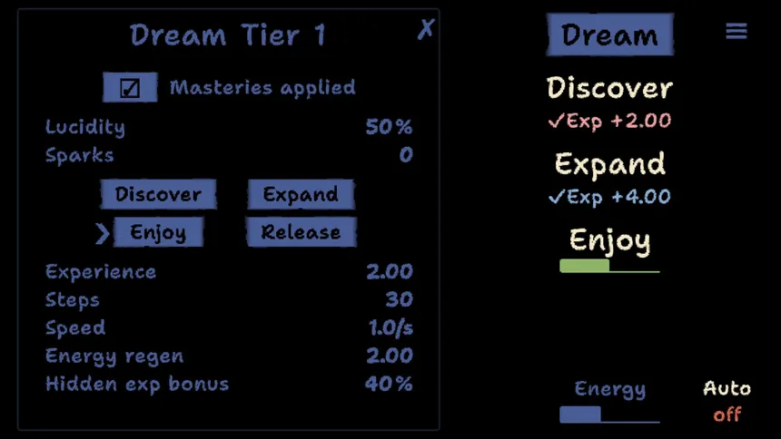 Не ждите динамичных сражений или сложных головоломок. “Сны” — это игра про плавность, гармонию и умение наслаждаться моментом. Однако, за кажущейся простотой скрывается глубокая система прогресса. Заработанный опыт позволит вам улучшать дом и осваивать десятки навыков, открывающих новые возможности и стратегии в создании и воплощении снов.