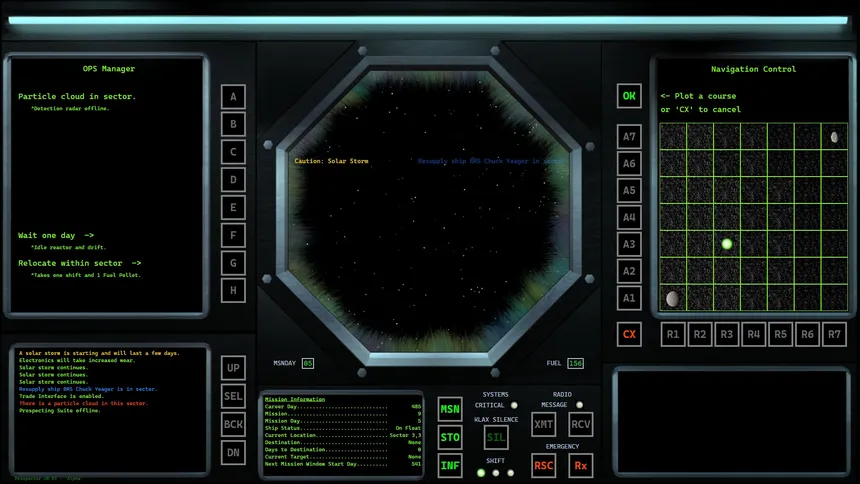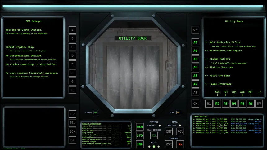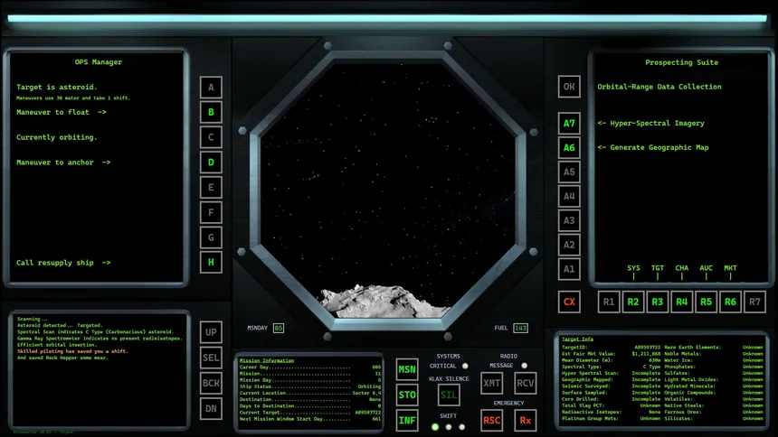 Beltlife: Prospector is a GUI-based "hard" sci-fi business/work sim with economy simulation and RPG elements. Your focus is on maintaining your ship's systems and your health while prospecting for asteroid claims to auction on simulated markets.