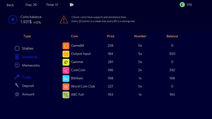 Игра предлагает три типа криптовалют, каждая со своими особенностями. Стабильные монеты – надежный, но не слишком прибыльный вариант, позволяющий получать небольшой, но гарантированный доход при внимательном отслеживании аномалий цен. Классические монеты предлагают точки поддержки и сопротивления, где можно совершать сделки, учитывая графики и временные интервалы. Ну а настоящим рисковикам понравятся мем-коины – хаотичные активы, которые могут принести баснословные деньги за мгновение… или обнулить ваш баланс.