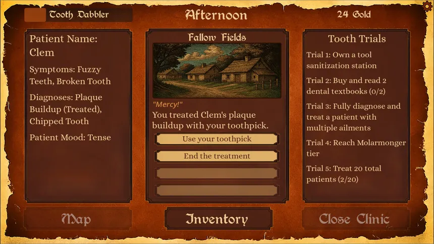 Rise from peasant dentist to royal healer in this quirky medieval dental simulation RPG. Treat patients, upgrade tools, improve your clinic, expand your knowledge, and restore Princess Penelope’s legendarily awful smile, all while facing sabotage from a jealous prince.