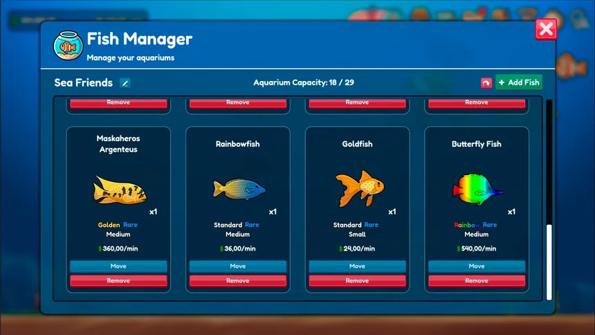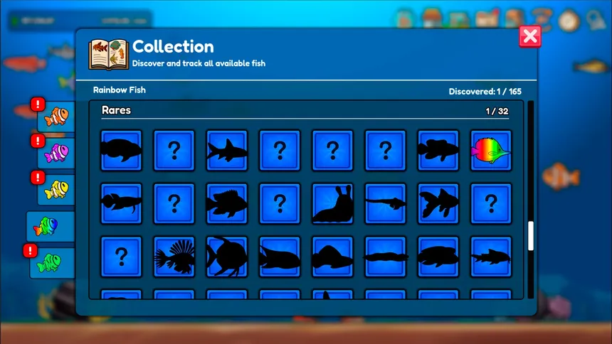 В Aquaidle вас ждет невероятное разнообразие: более 2400 уникальных рыб, разделенных на 160 базовых видов с 5 вариациями и 3 размерами. Каждое новое открытие — это маленькая победа, а заполнение аквариумов редкими комбинациями — увлекательная долгосрочная цель для настоящих коллекционеров.